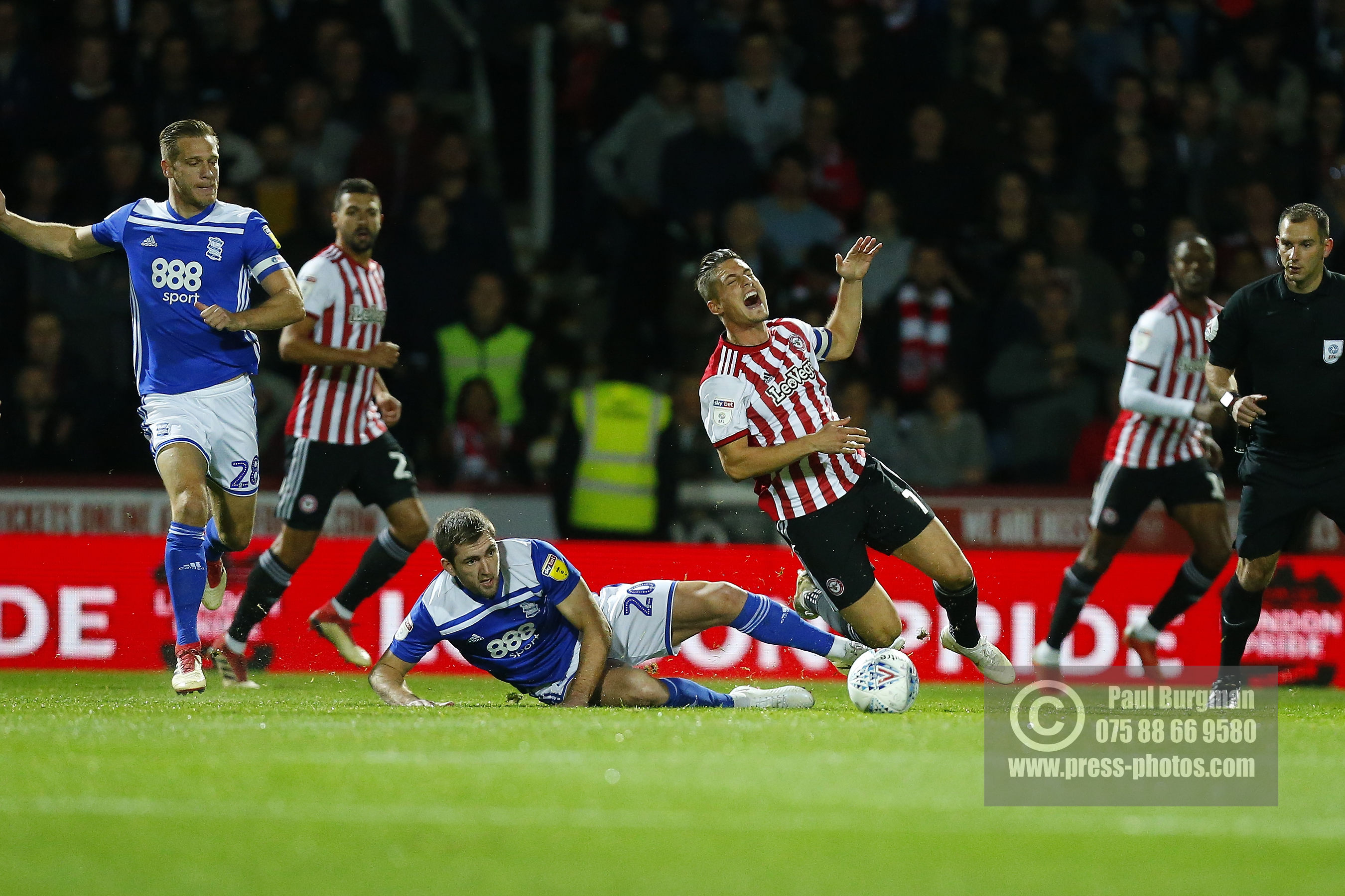Brentford's Sergi Canos fouled by City's Midfielder Gary Gardner during the EFL Sky Bet Championship match between Brentford and Birmingham City at Griffin Park, London, England on 2 October 2018.