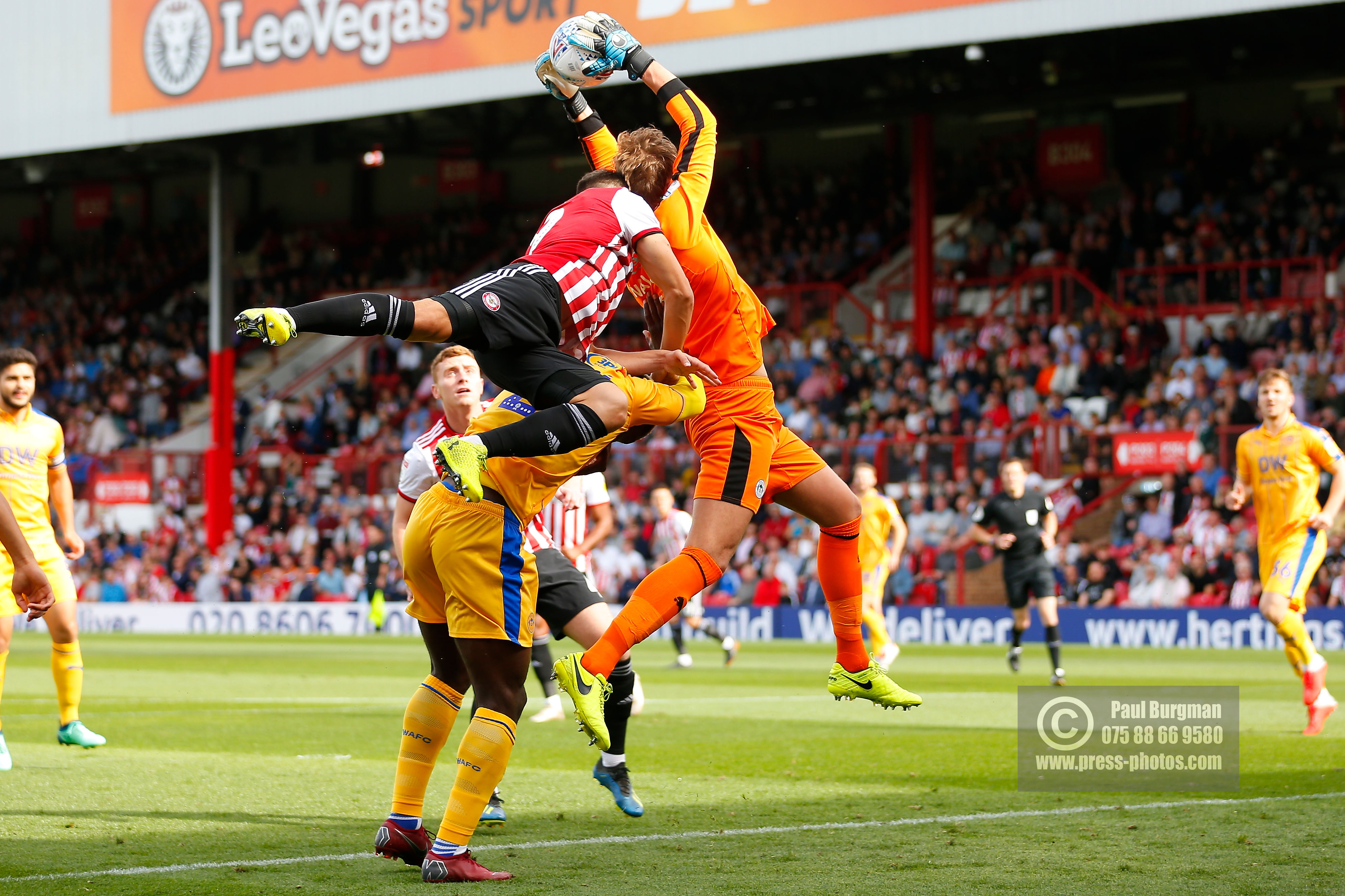 Brentford's Neal Maupay challenges Wigan's Goalkeeper Christian Walton during the EFL Sky Bet Championship match between Brentford and Wigan Athletic at Griffin Park, London, England on 15 September 2018.