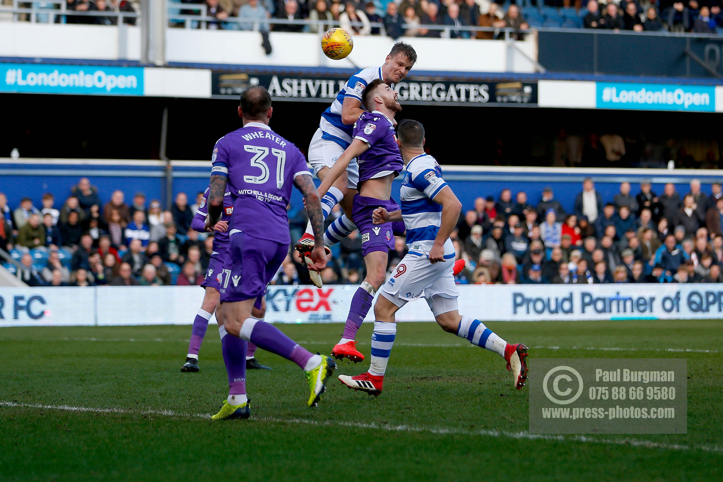 17/02/2018. Queens Park Rangers v Bolton Wanderers. SkyBet Championship Action from Loftus Road. QPRÕs Matt SMITH