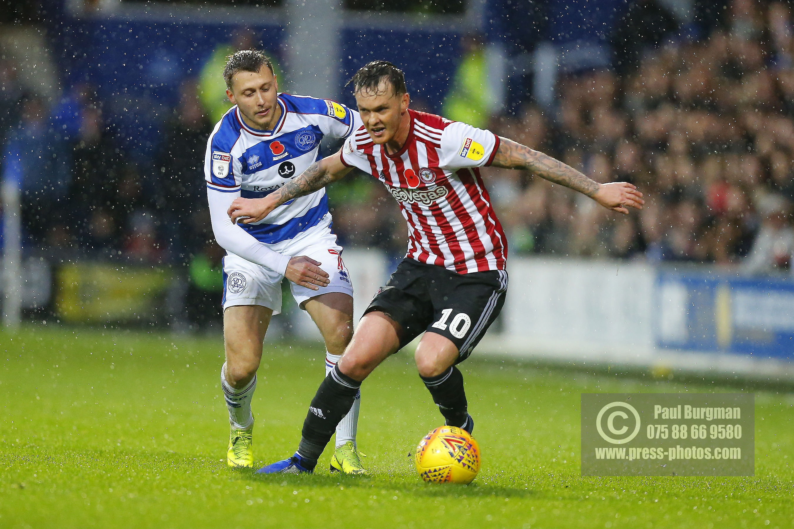 Brentford's Midfielder Josh McEachran & Rangers Midfielder Luke Freeman during the EFL Sky Bet Championship match between Queens Park Rangers and Brentford at the Loftus Road Stadium, London, England on 10 November 2018.